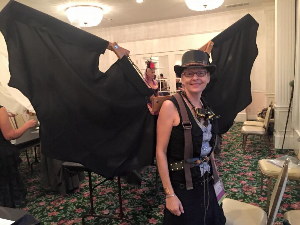 This weekend I’m at the Gaslight Expo Convention in San Diego, where I’m a panelist with several other authors on Friday and Saturday. From 5-7 p.m. this evening I attended this awesome workshop with the Iron Tailor Bob Mogg and made these cool 7′ long retractable steampunk wings! I’m wearing them tomorrow with my “mad scientist” outfit. I’m going to be Dr. Calamity!